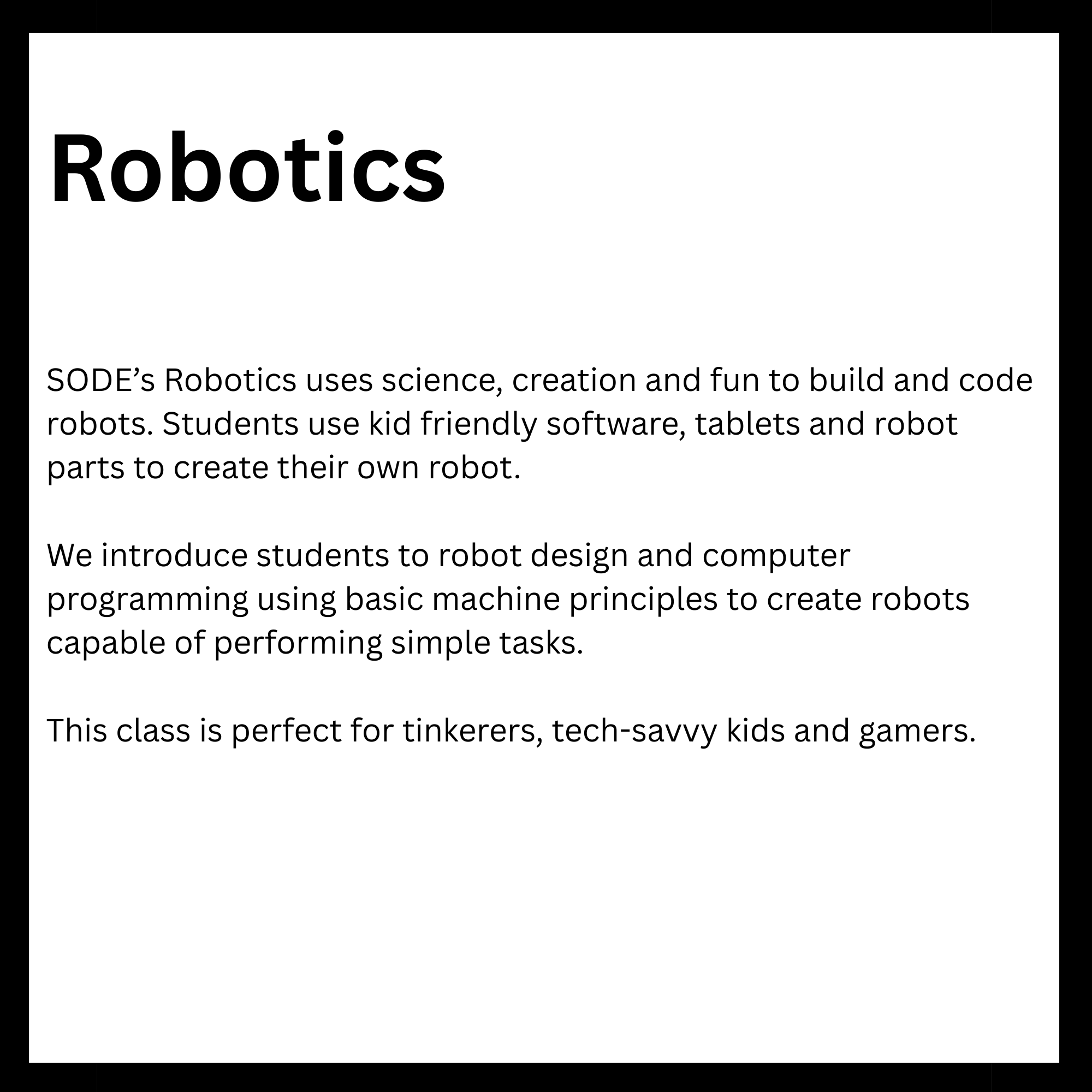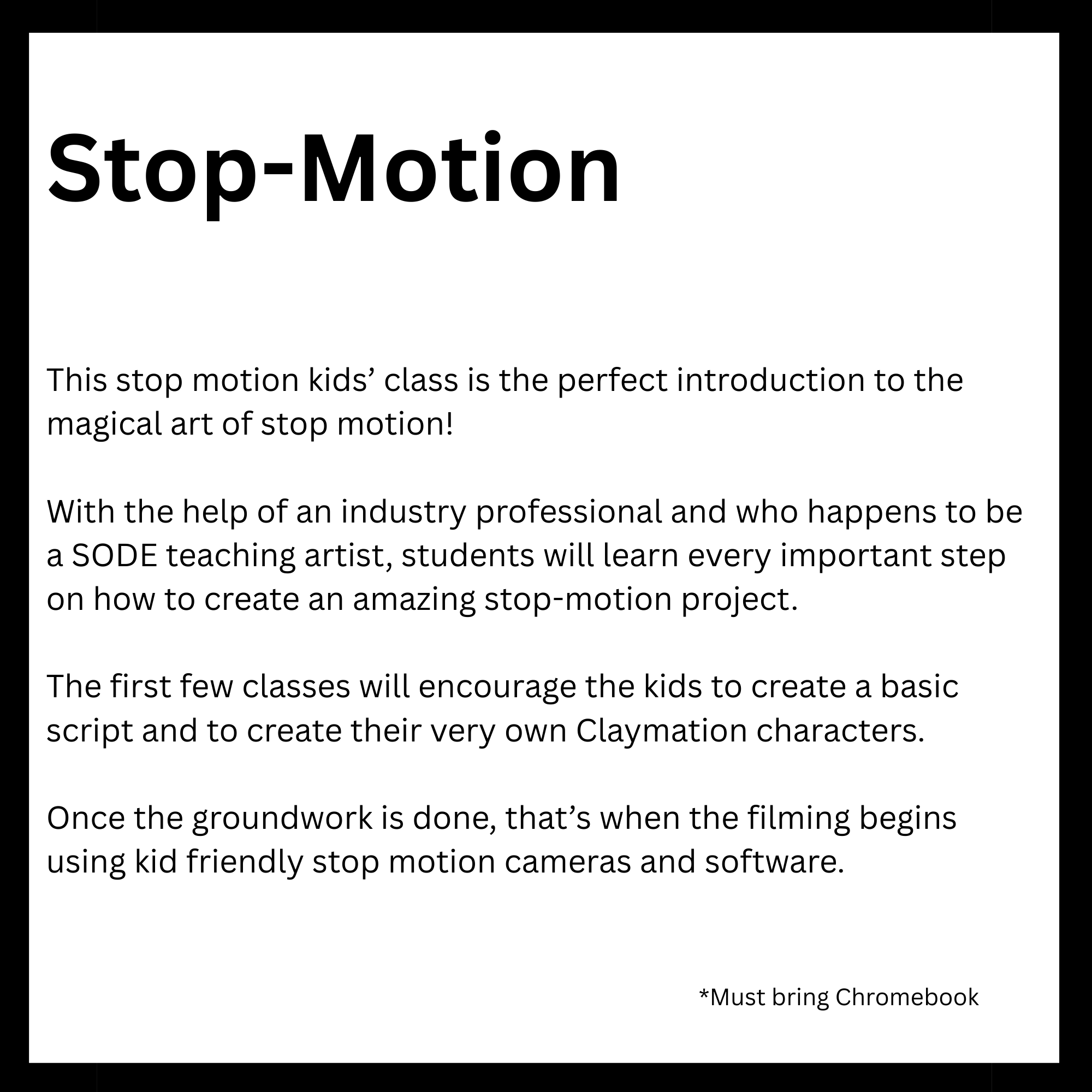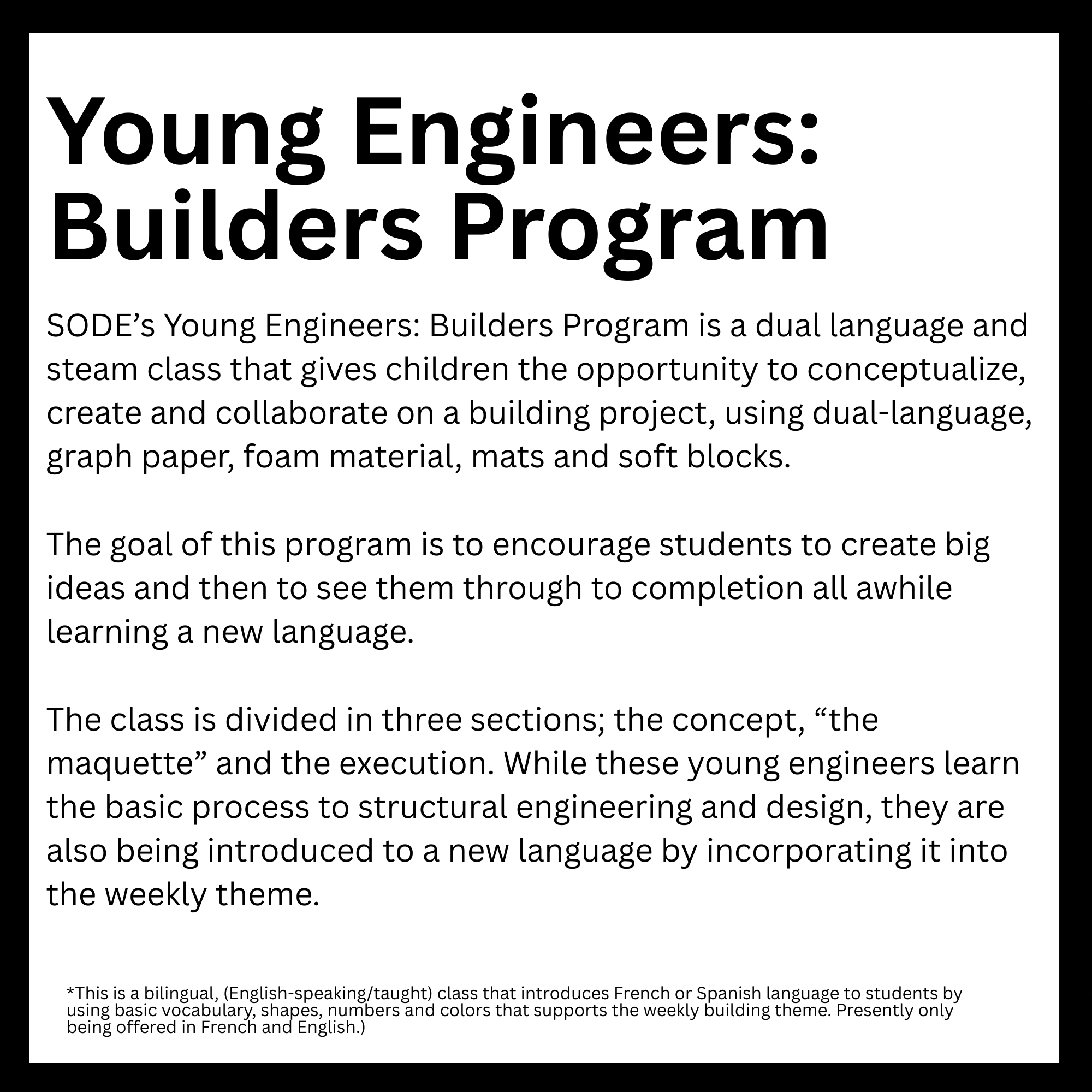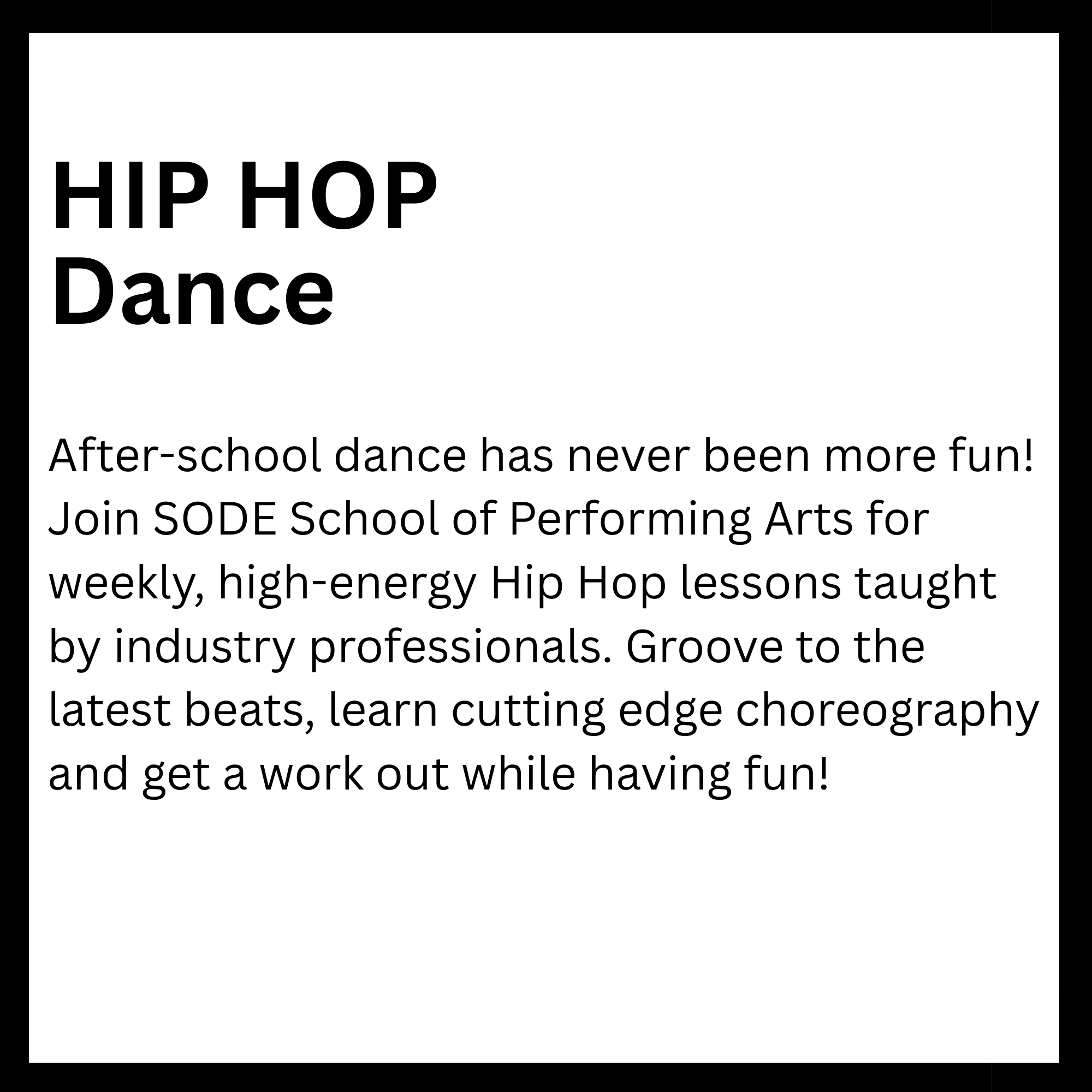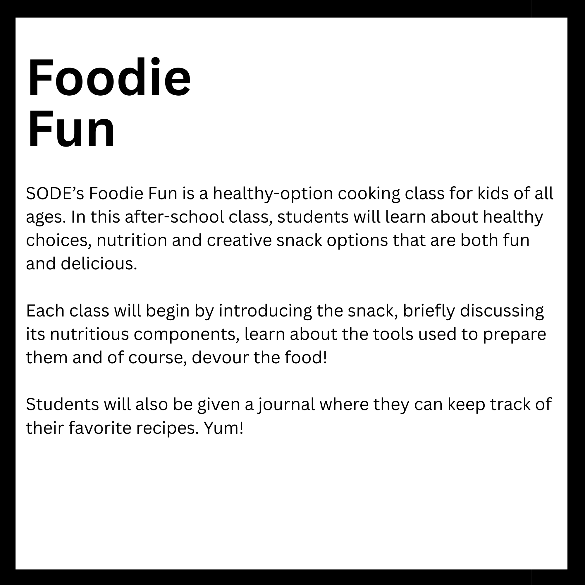 Connected to schools, provide academic support and creative outlets in a safe environment. They reinforce classroom learning while promoting teamwork and problem-solving skills. Children in these programs tend to excel academically and stay engaged. Overall, they help foster confidence and develop lifelong interests. Here is a list of After-School enrichment programs SODE is offering in 2026. *These classes are also offered for day camps and workshops.