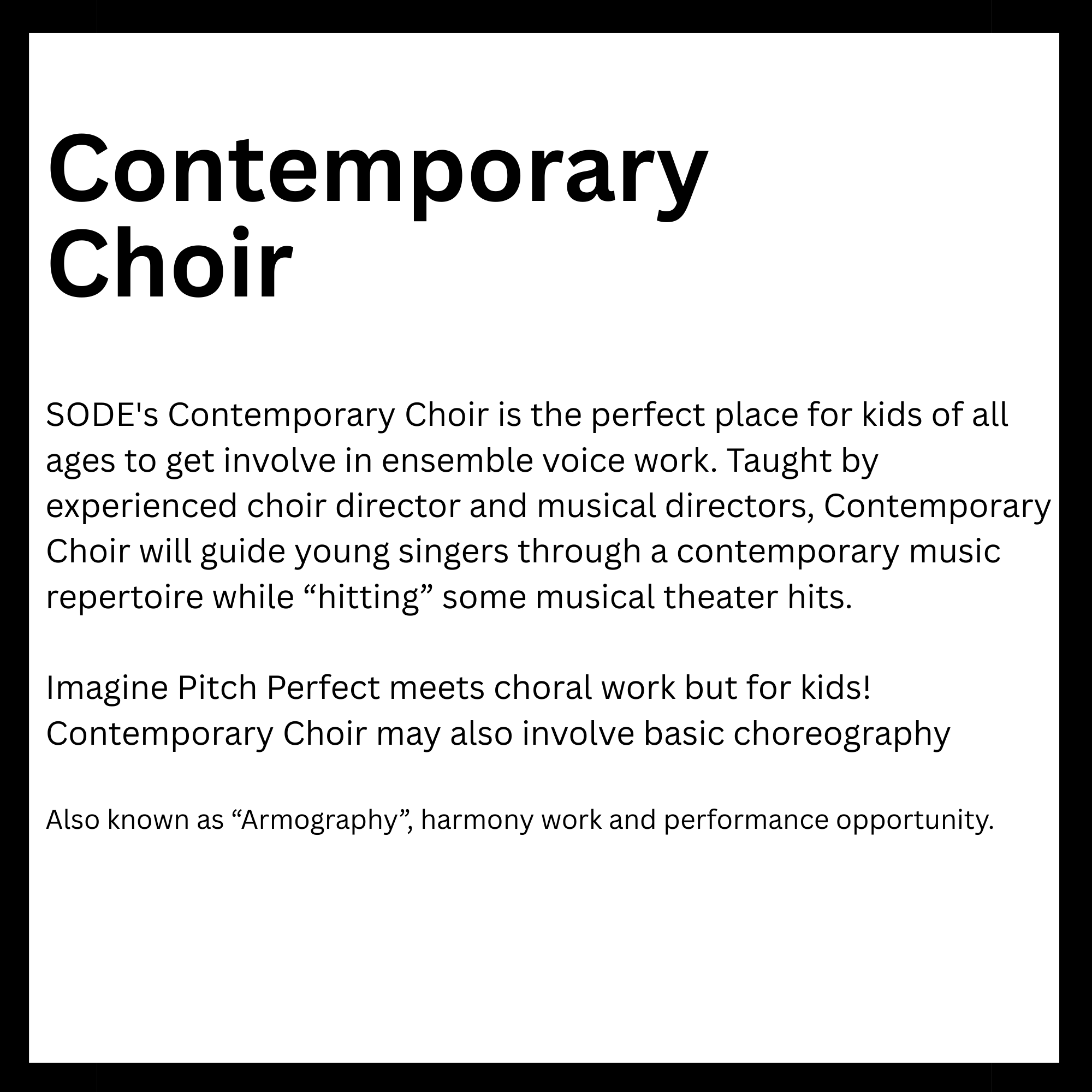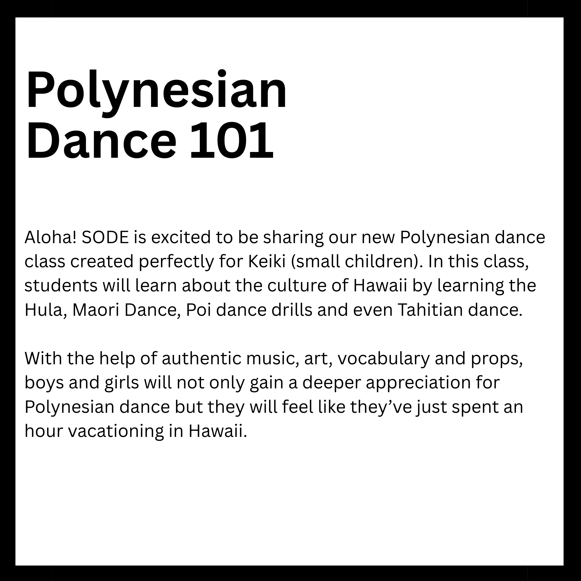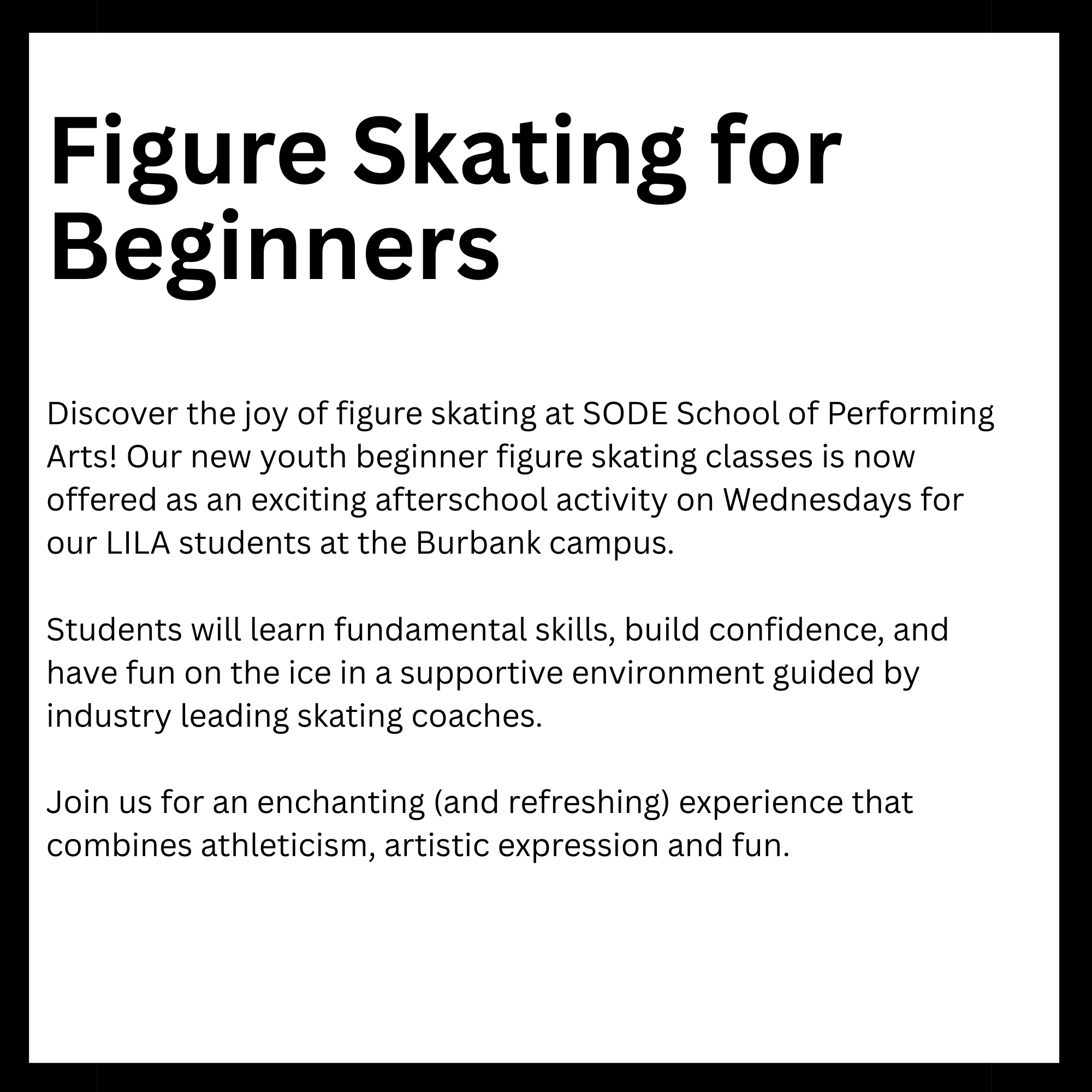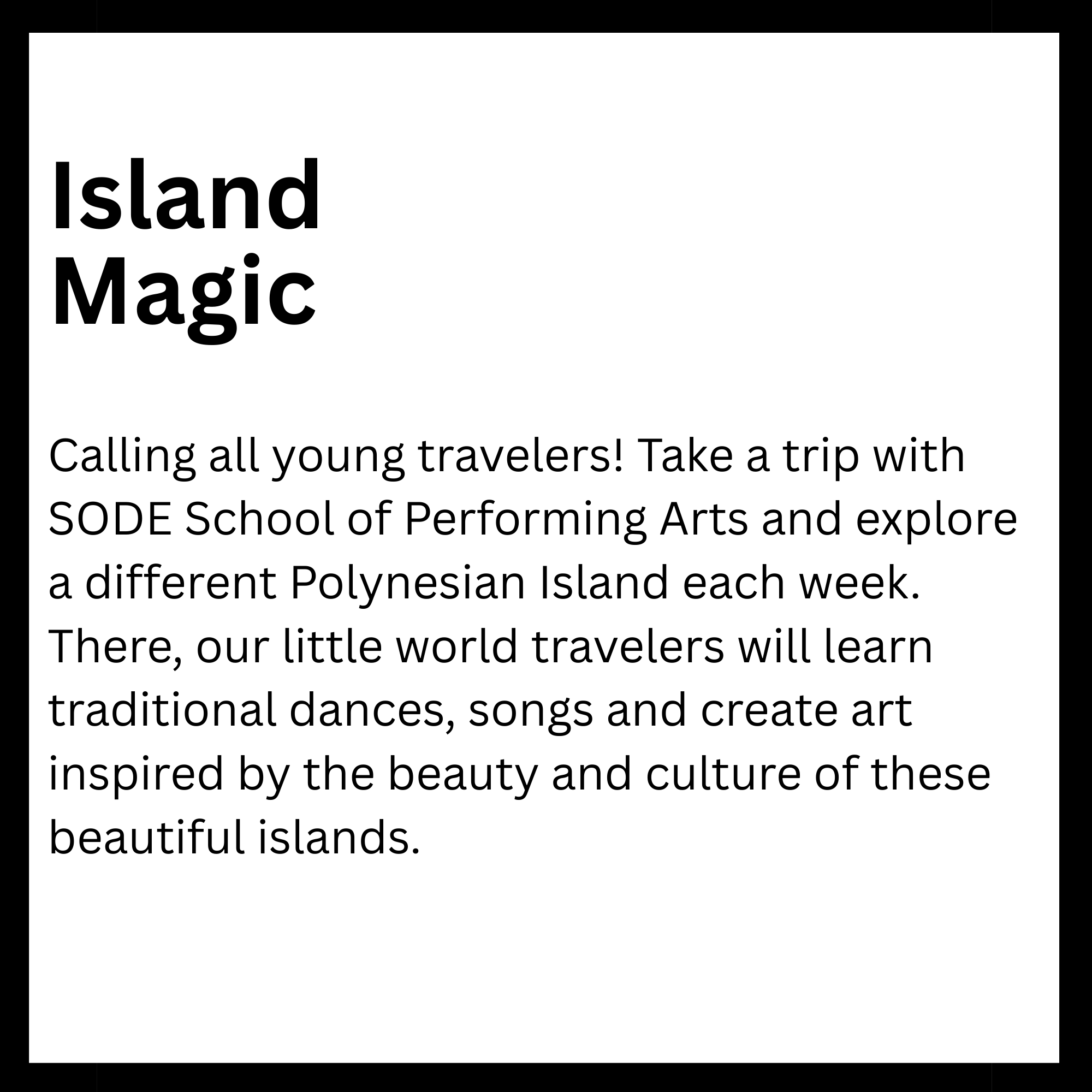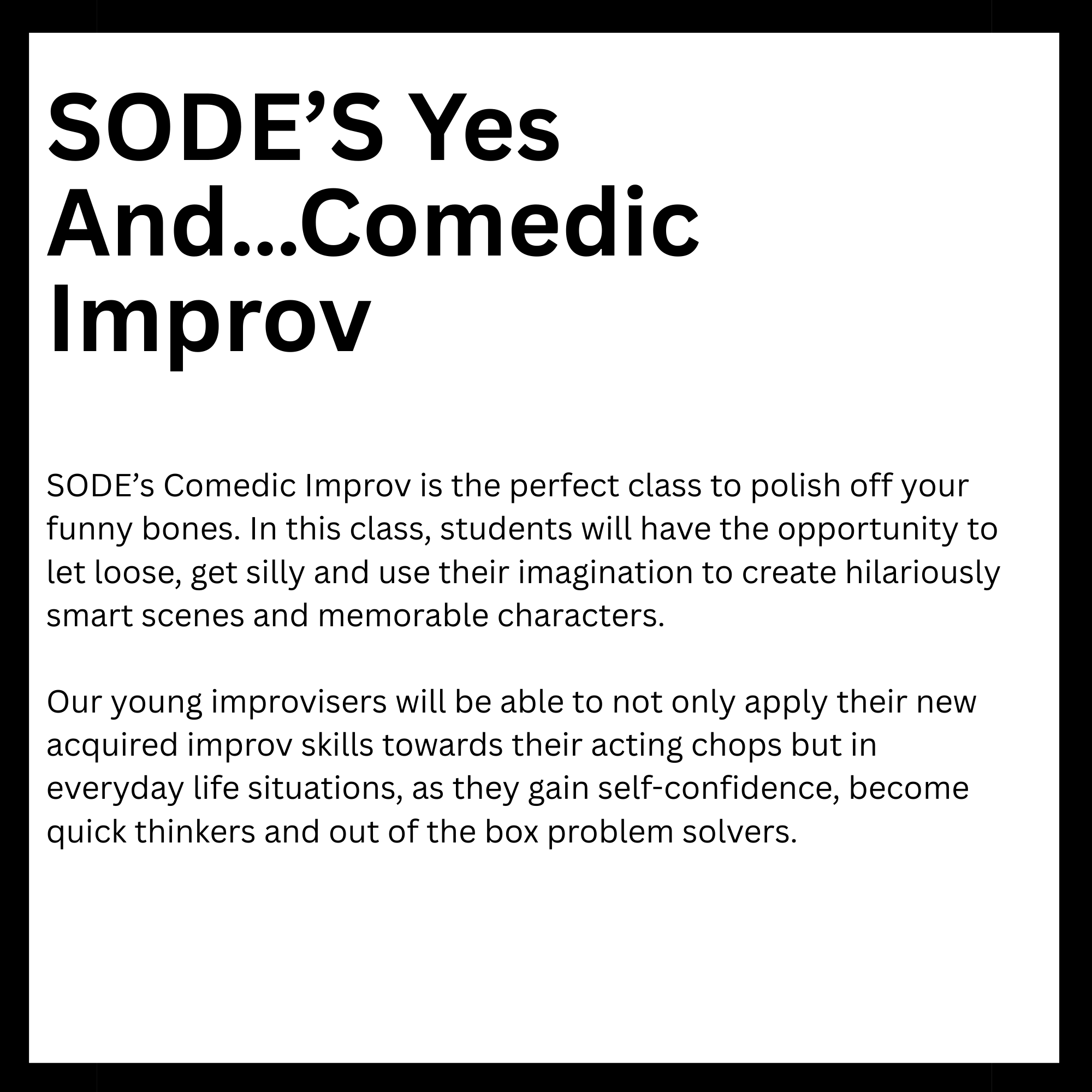 Connected to schools, provide academic support and creative outlets in a safe environment. They reinforce classroom learning while promoting teamwork and problem-solving skills. Children in these programs tend to excel academically and stay engaged. Overall, they help foster confidence and develop lifelong interests. Here is a list of After-School enrichment programs SODE is offering in 2026. *These classes are also offered for day camps and workshops.