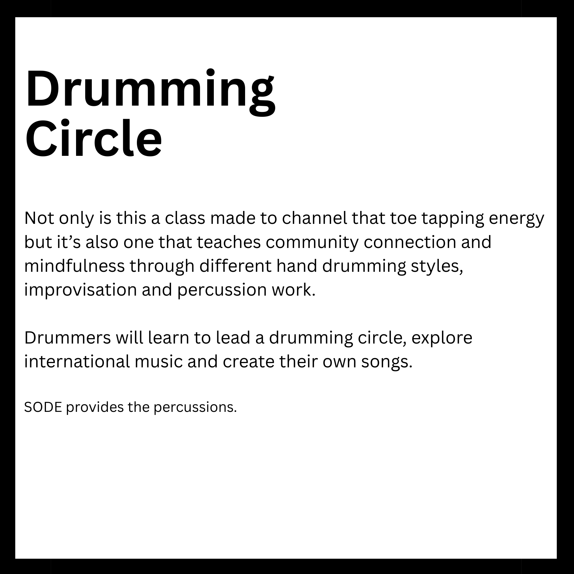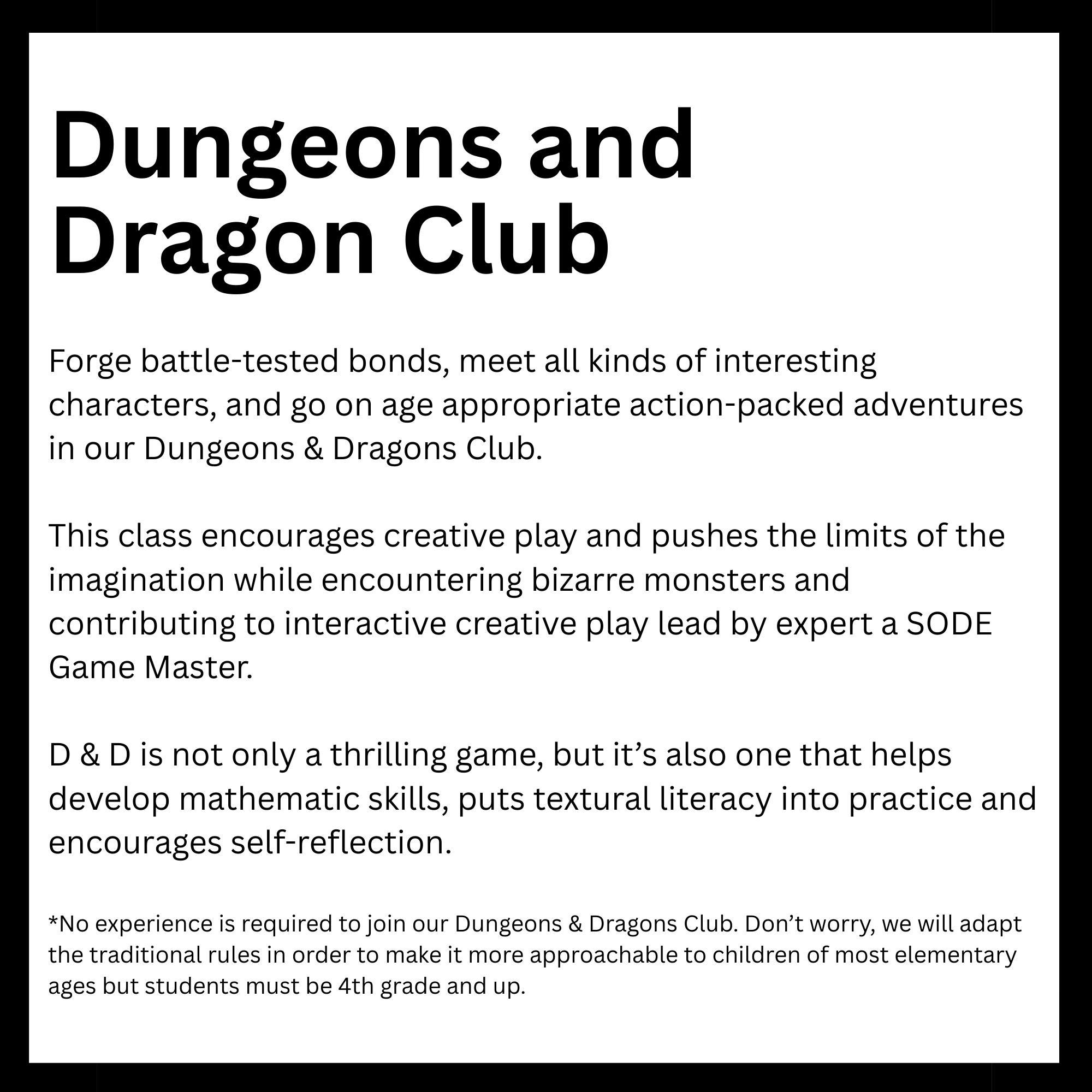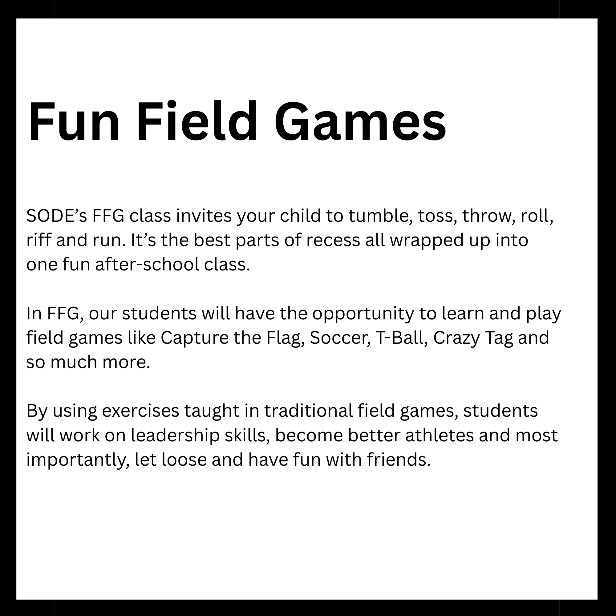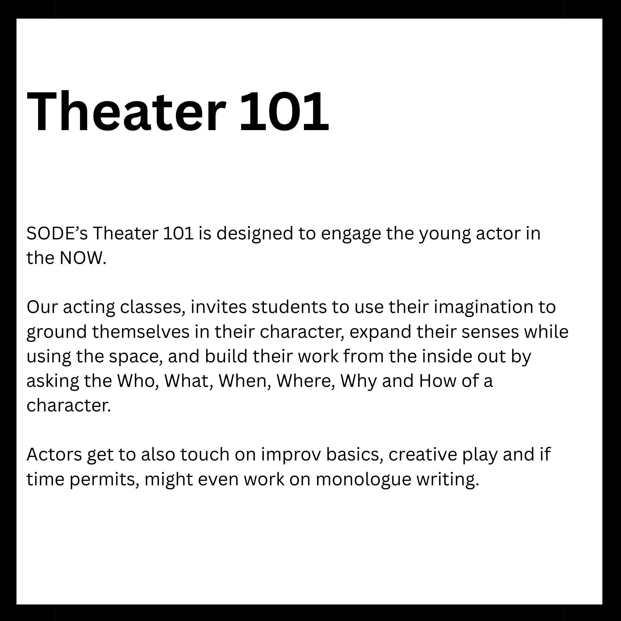 Connected to schools, provide academic support and creative outlets in a safe environment. They reinforce classroom learning while promoting teamwork and problem-solving skills. Children in these programs tend to excel academically and stay engaged. Overall, they help foster confidence and develop lifelong interests. Here is a list of After-School enrichment programs SODE is offering in 2026. *These classes are also offered for day camps and workshops.
