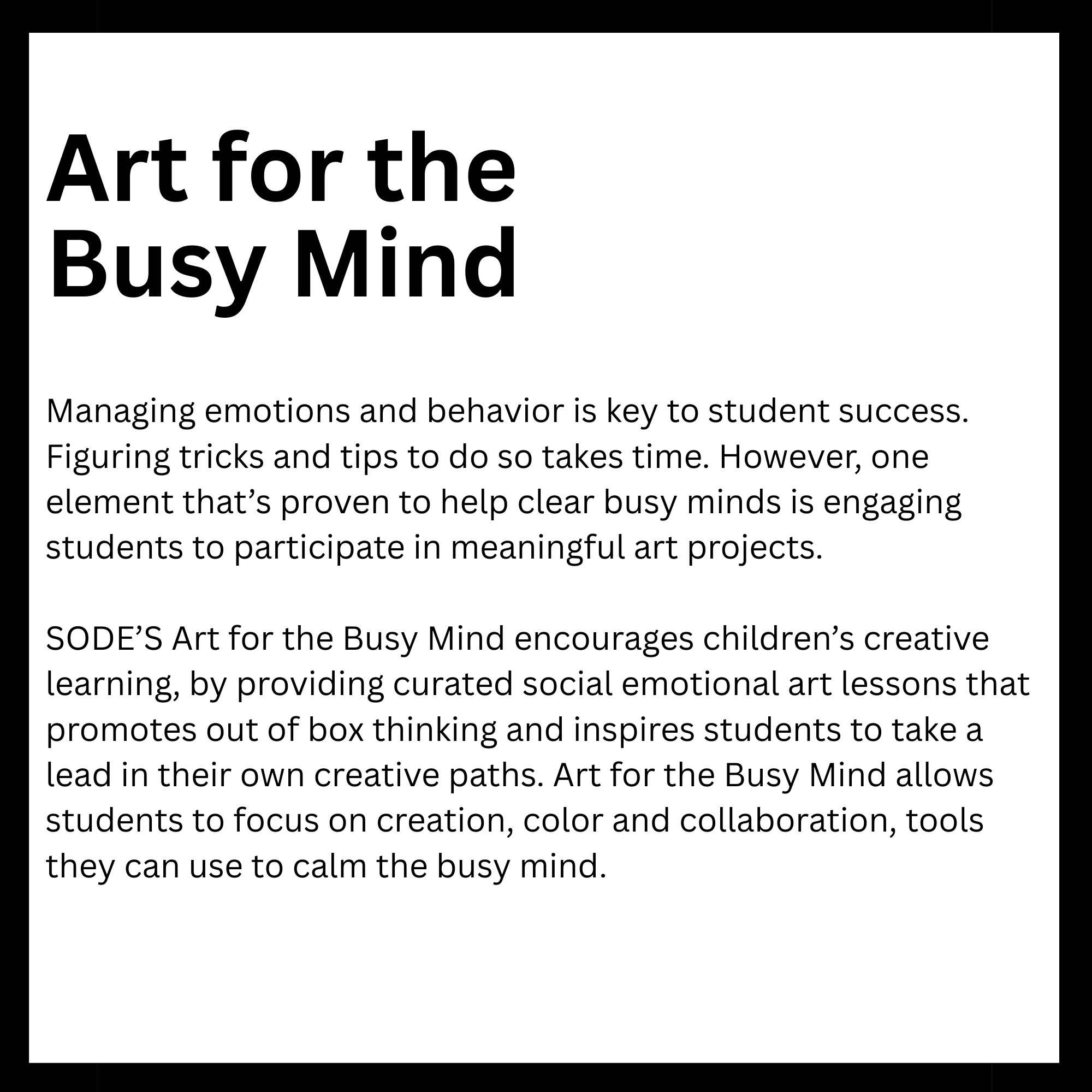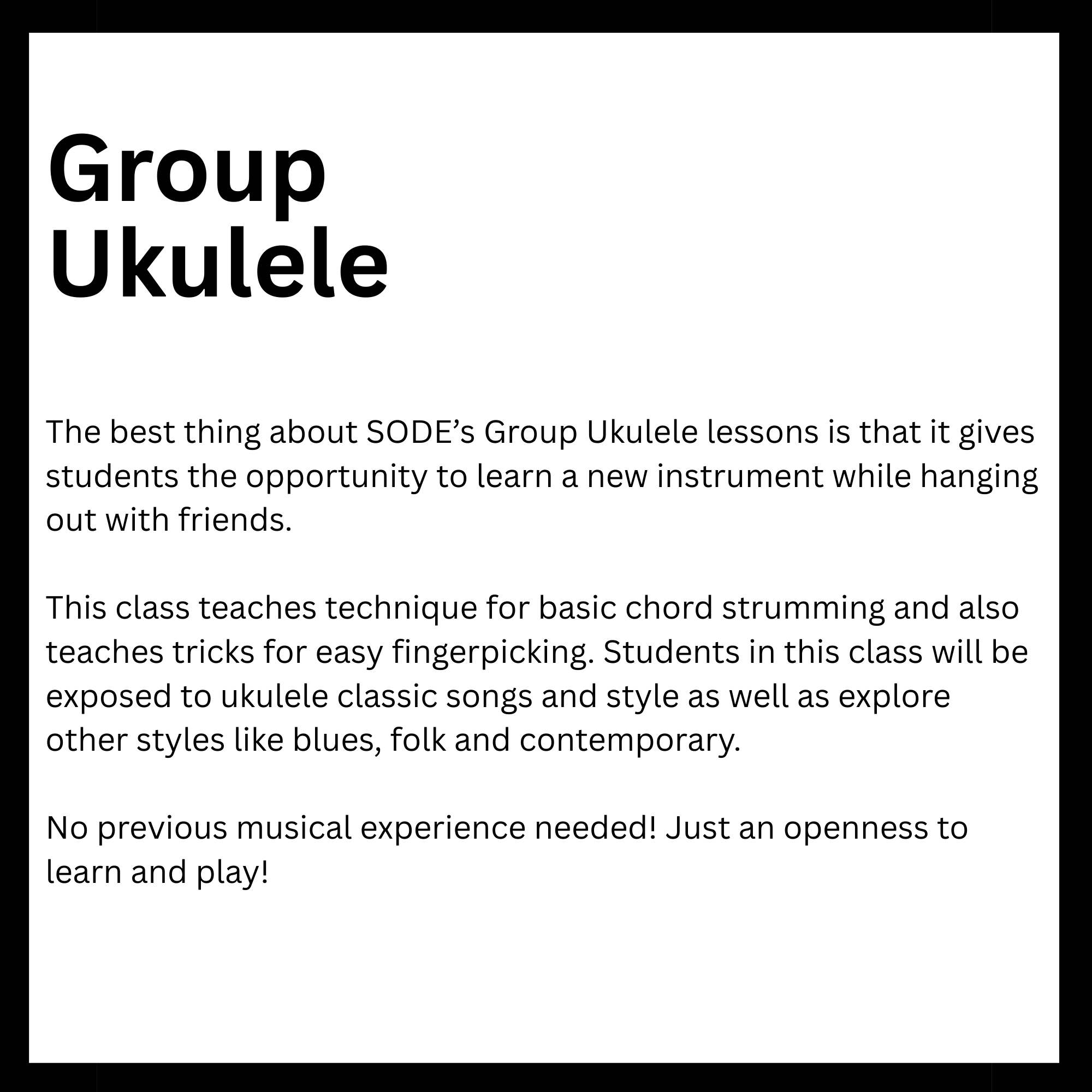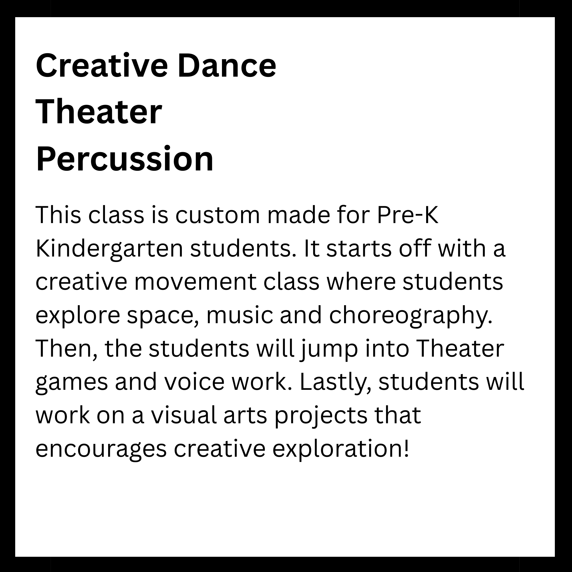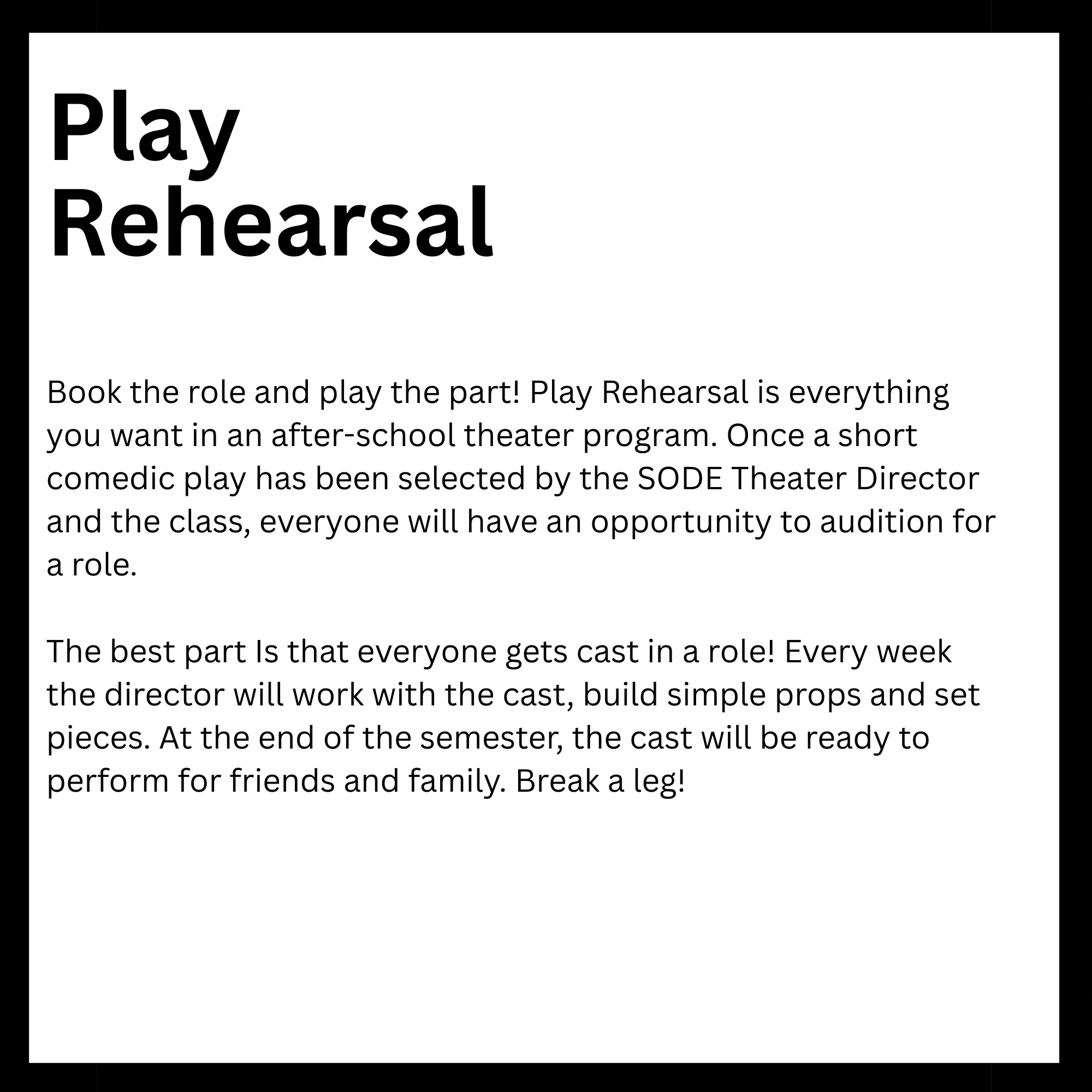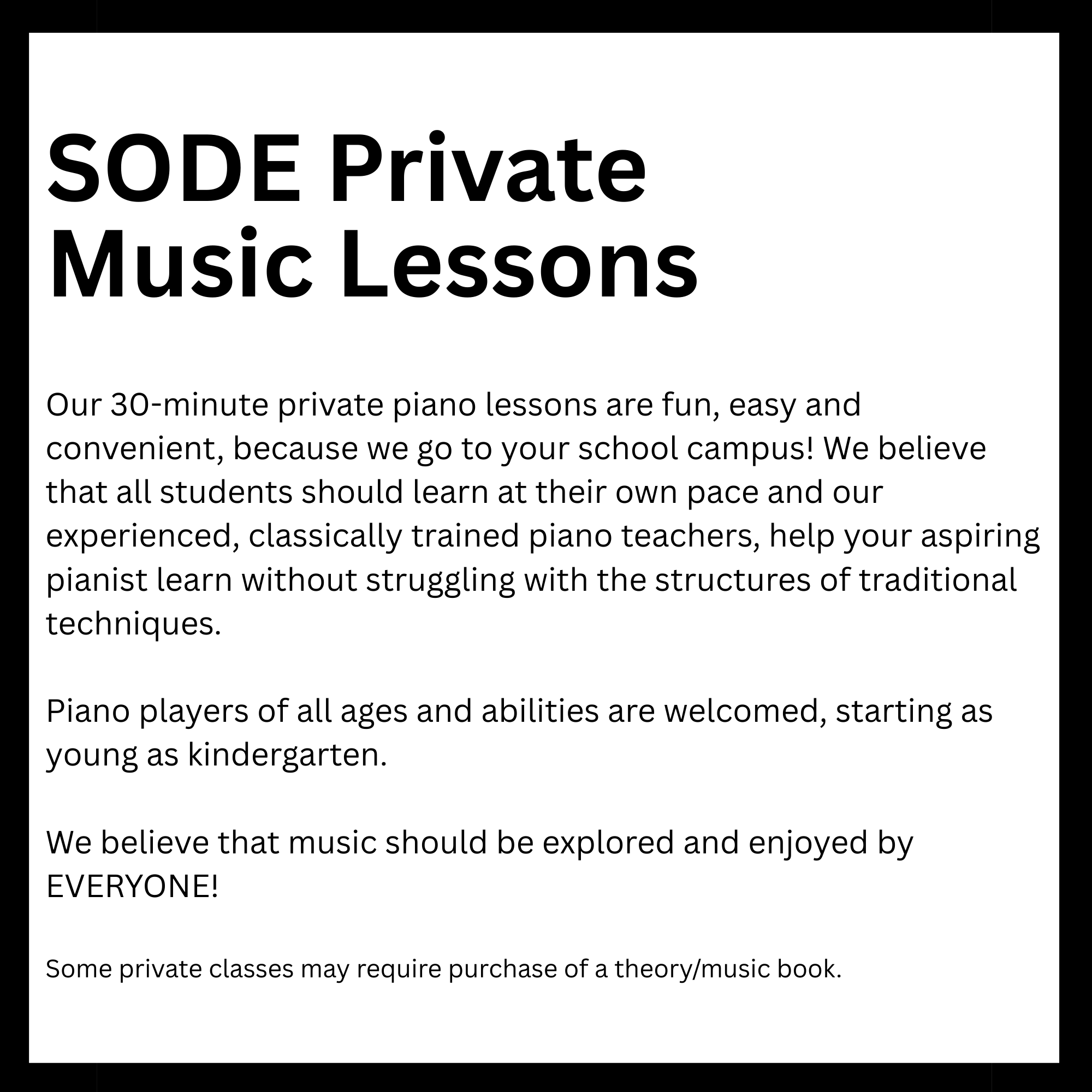 Connected to schools, provide academic support and creative outlets in a safe environment. They reinforce classroom learning while promoting teamwork and problem-solving skills. Children in these programs tend to excel academically and stay engaged. Overall, they help foster confidence and develop lifelong interests. Here is a list of After-School enrichment programs SODE is offering in 2026. *These classes are also offered for day camps and workshops.