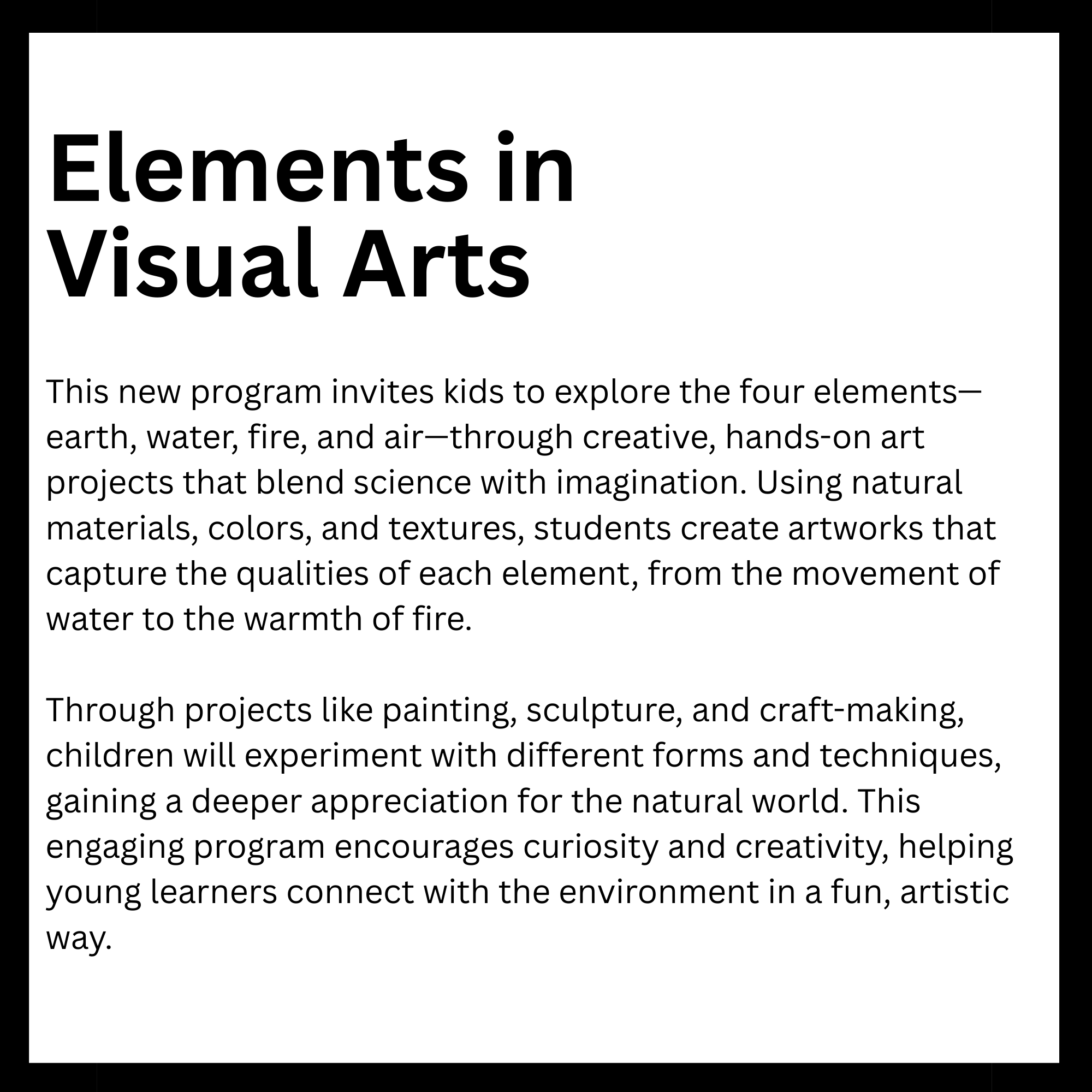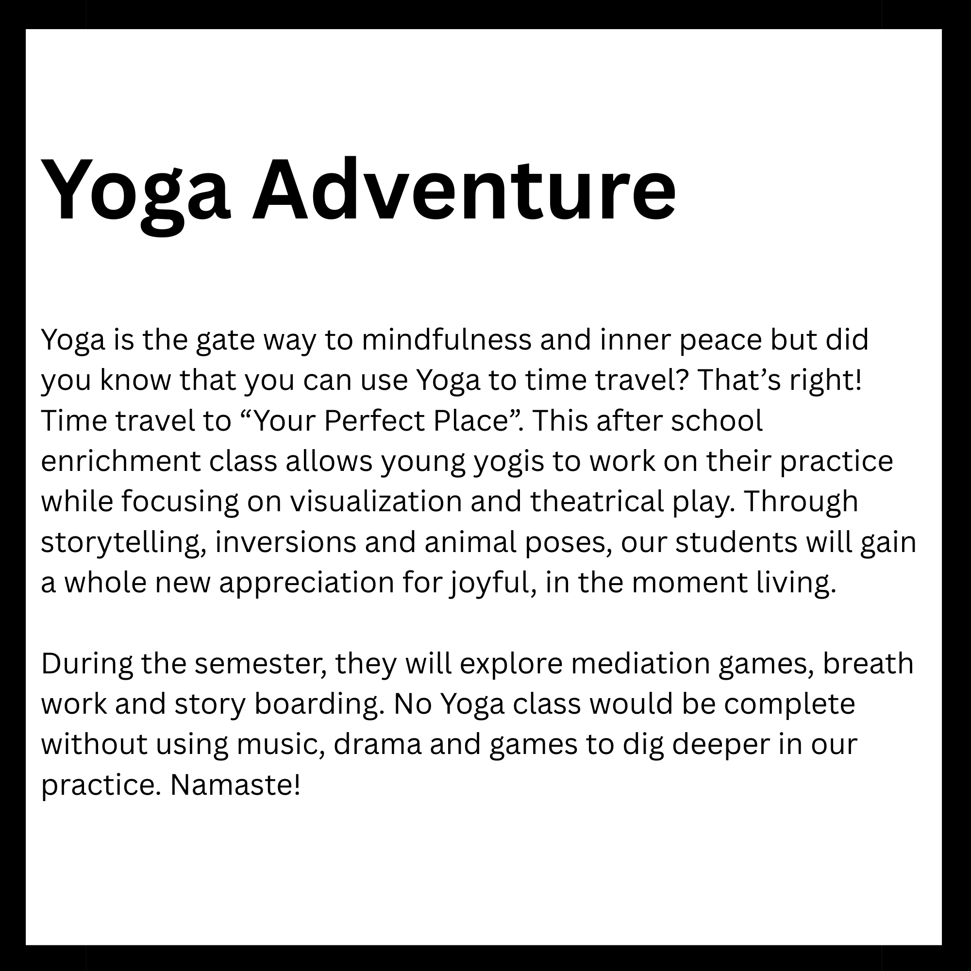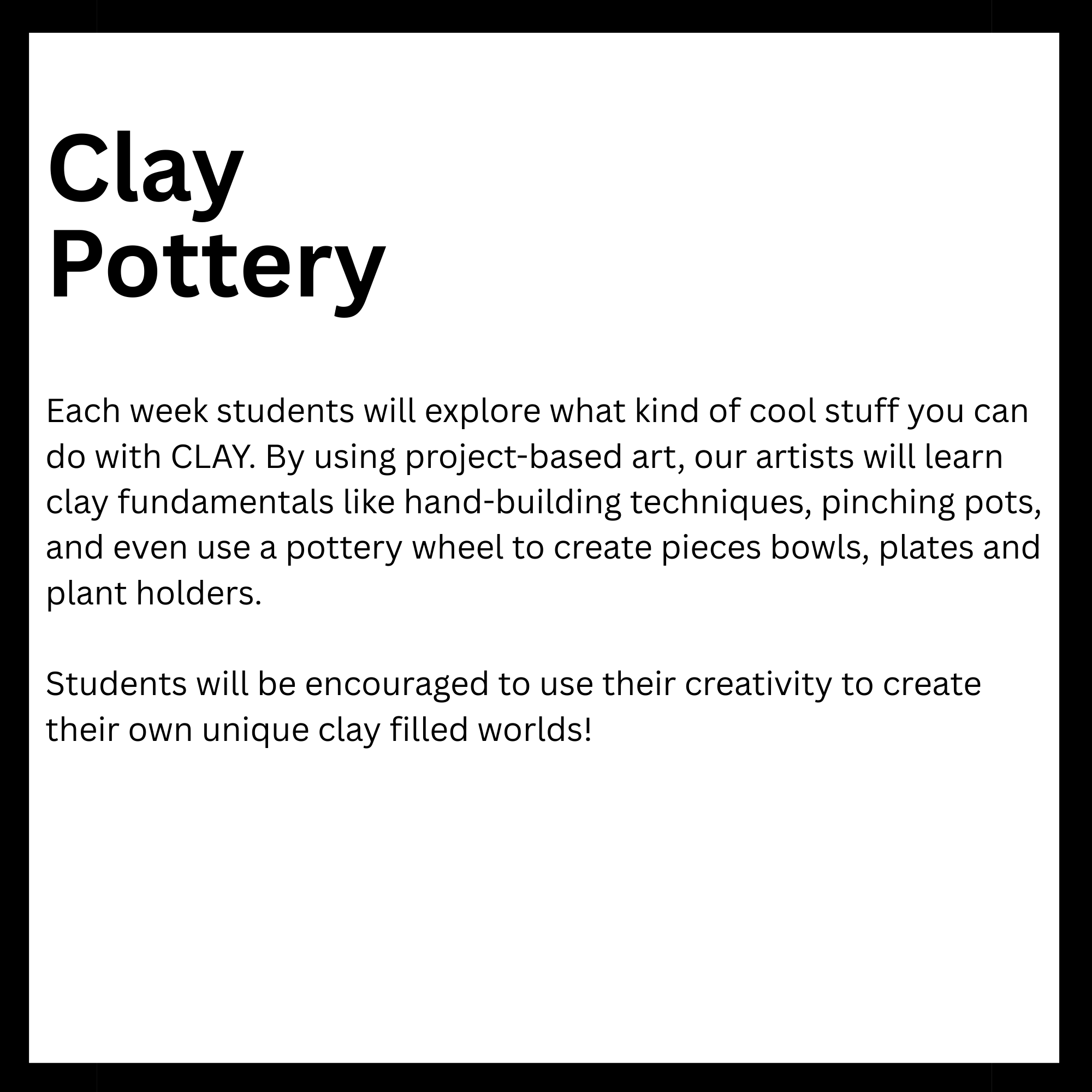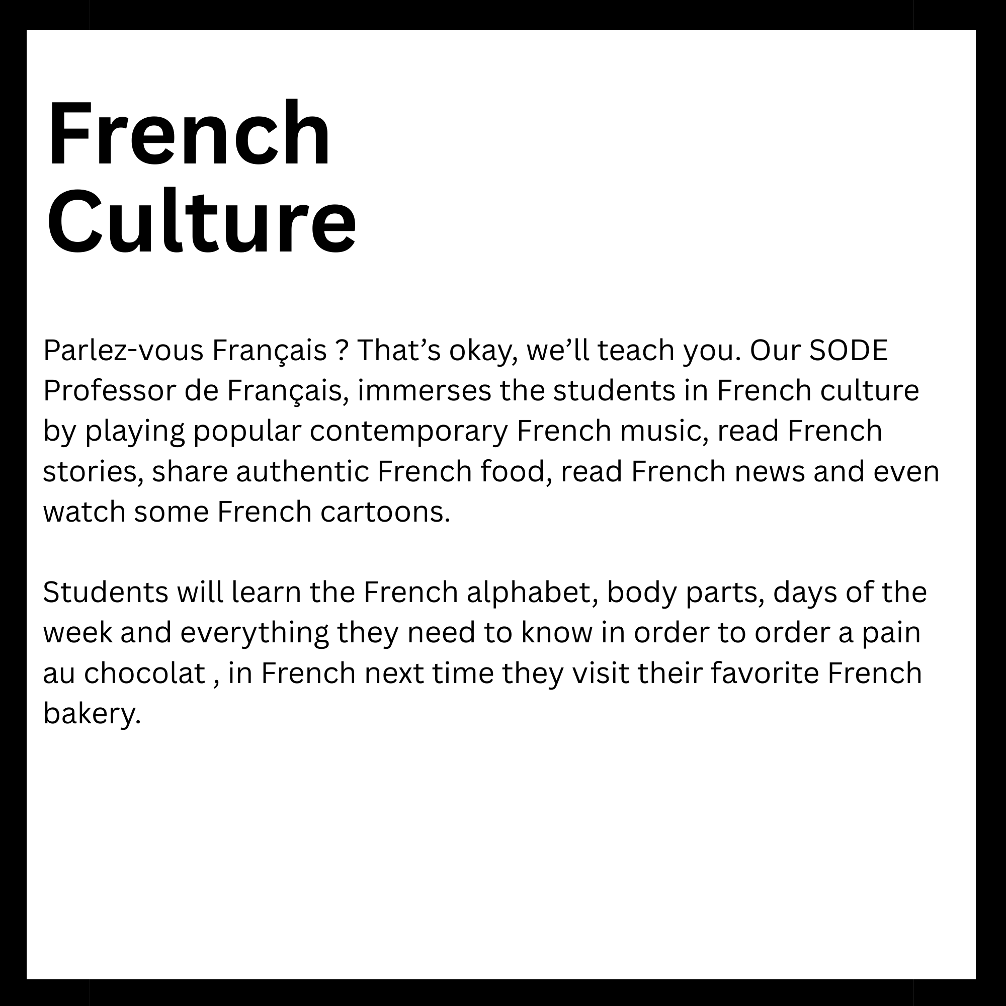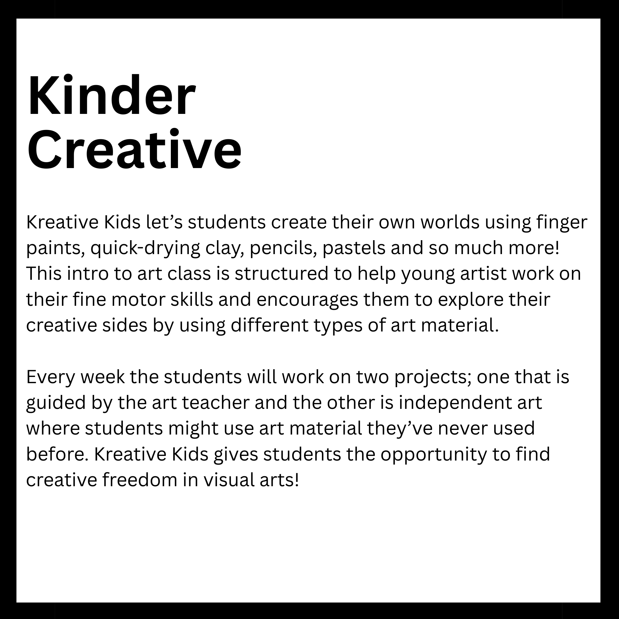 Connected to schools, provide academic support and creative outlets in a safe environment. They reinforce classroom learning while promoting teamwork and problem-solving skills. Children in these programs tend to excel academically and stay engaged. Overall, they help foster confidence and develop lifelong interests. Here is a list of After-School enrichment programs SODE is offering in 2026. *These classes are also offered for day camps and workshops.