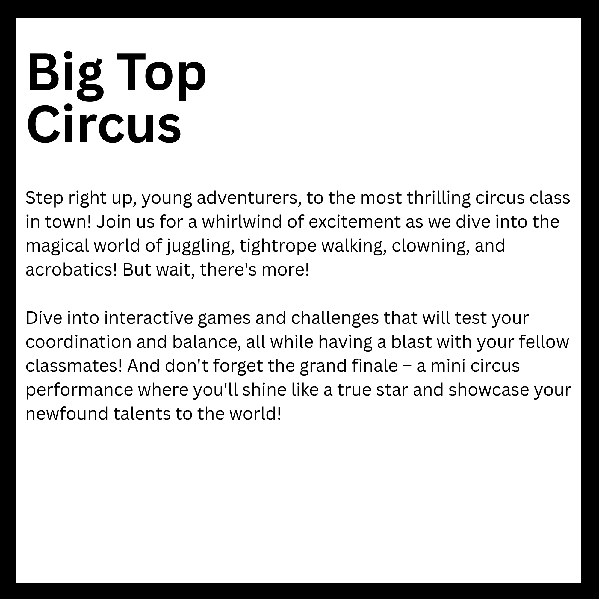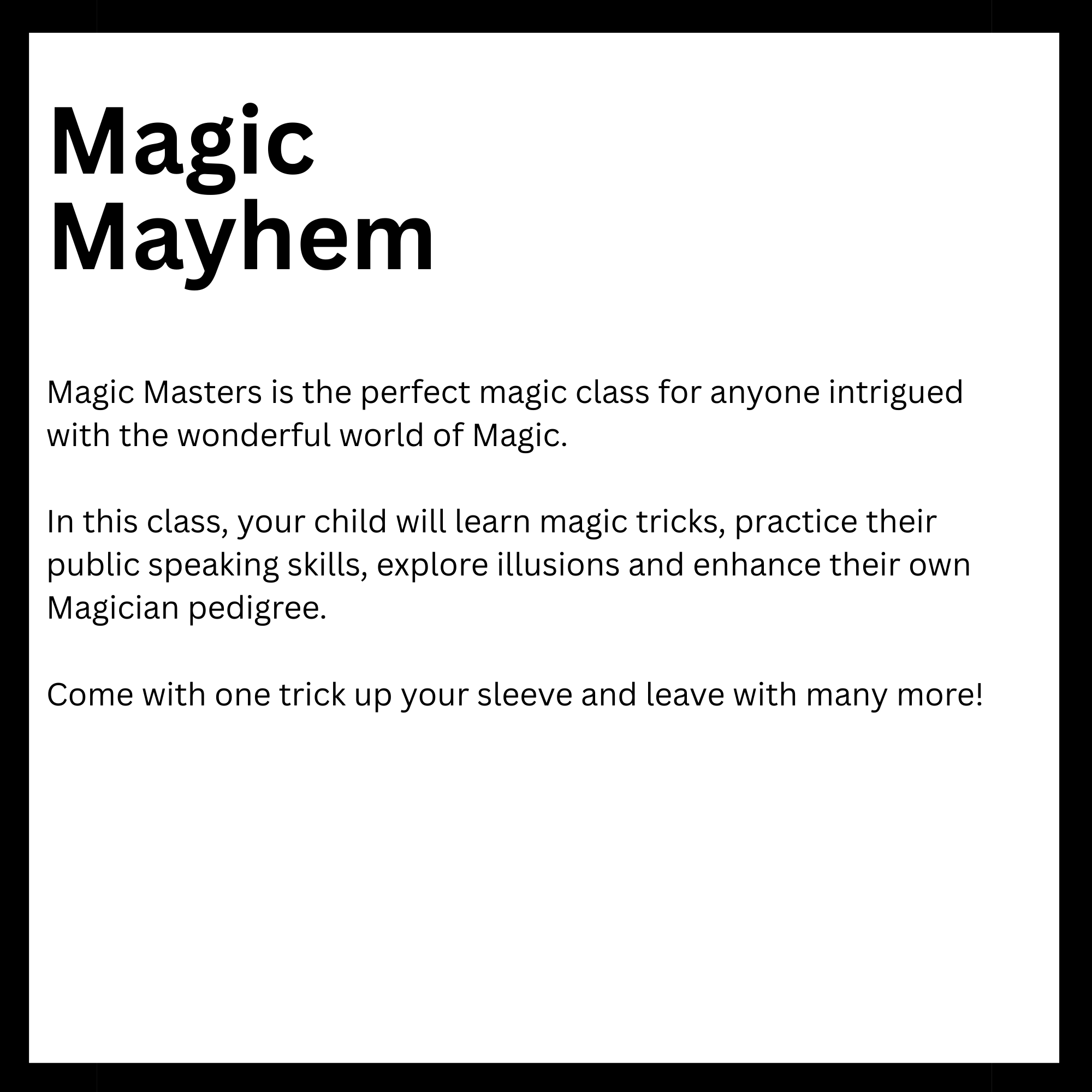 Monday Dates: March 9, 16, 23 April 6, 13 20, 27 and the Showcase is on May 1st at 5:30PM