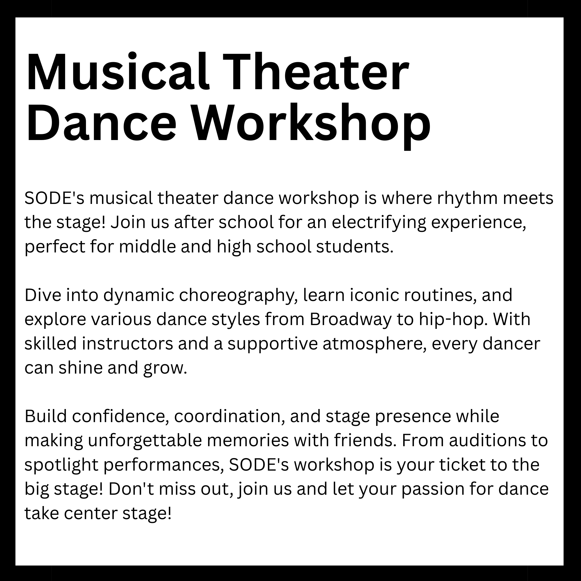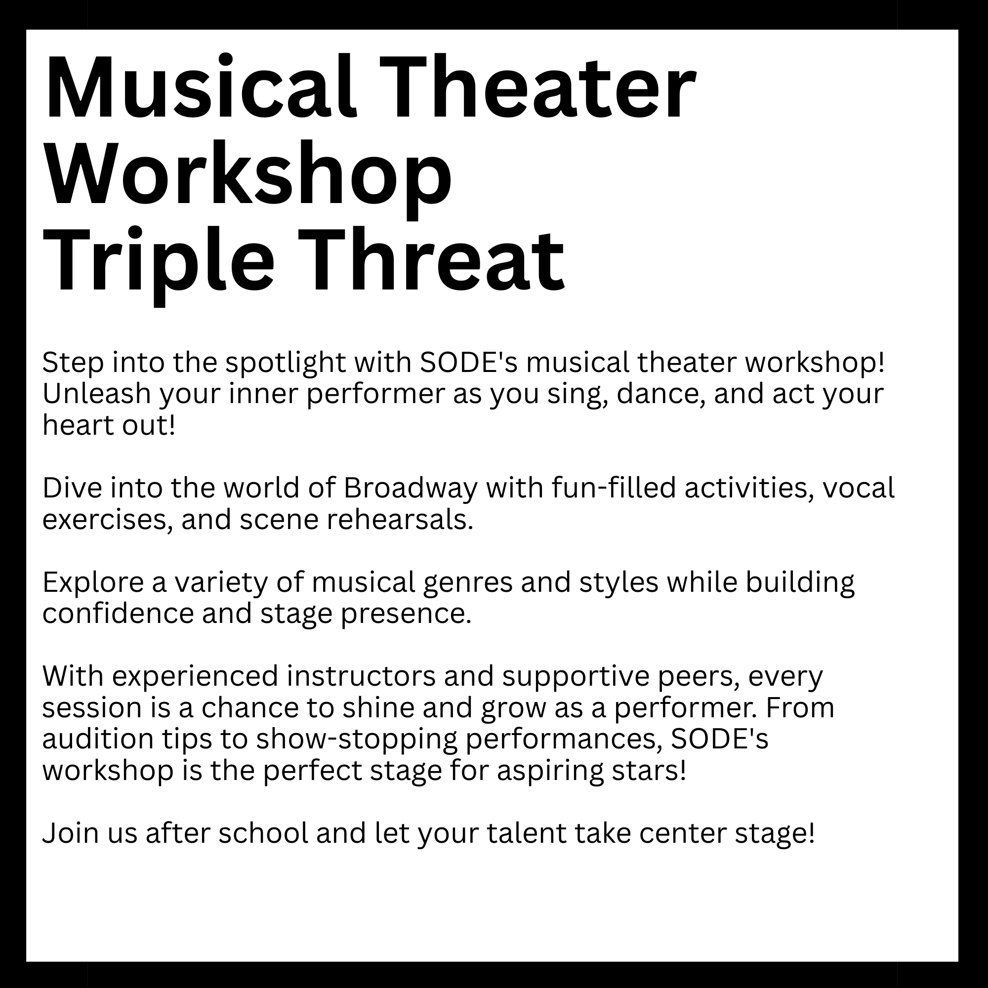 SODE School of Performing Arts is proud to present our Third Annual FREE after-school performing arts enrichment program and culminating performance for all Woodland Hills Elementary!